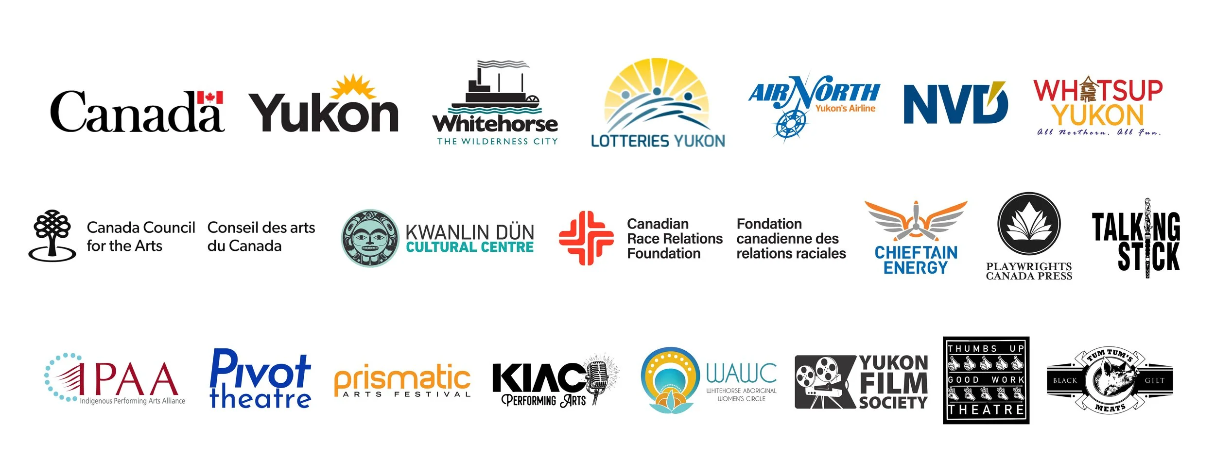 We acknowledge the support of the Government of Canada (nous reconnaissons l'appui du gouvernement du Canada), the Canada Council for the Arts, the Government of Yukon, the City of Whitehorse and Lotteries Yukon. We acknowledge the support of the Canadian Race Relations Foundation with funding provided by the Government of Canada. Funding for Gwaandak Theatre is made possible through the assistance of Arts Operating Fund - Annual Operating Component, Department of Tourism and Culture, Jen Gehmair, Minister.