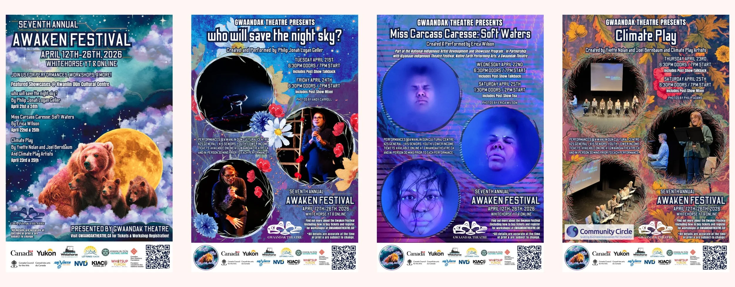 We also thank the Kwanlin Dün Cultural Centre and their staff for their generous support as our Festival Hosts as well as Air North, Yukon’s Airline and Northern Vision Development LP (NVD) for their continued support of visiting artists. We are also grateful to What’s Up Yukon for their promotional support and to Thumbs Up Good Work Theatre, Whitehorse Aboriginal Women’s Circle, and Yukon Film Society for their partnership in sharing Local Presentations during Awaken, as well as additional support towards workshops and events.