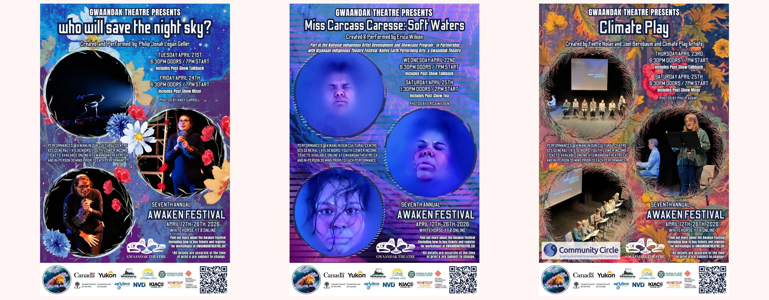 There is possibility of ASL Interpretation being provided during the showcases performances of who will save the night sky? on Tuesday April 21st, Miss Carcass Caresse: Soft Waters on Wednesday April 22nd, and Climate Play on Thursday April 23rd. If you would like to request ASL interpretation for any / all of these events, please email info@gwaandaktheatre.ca prior to 12PM Yukon Time on Tuesday April 7th, as ASL interpretation availability for these specific performances will be subject to community response received by this deadline. If you purchase a ticket prior to this date/time and would like to request ASL interpretation, you can also do so via the comments section after making your purchase.