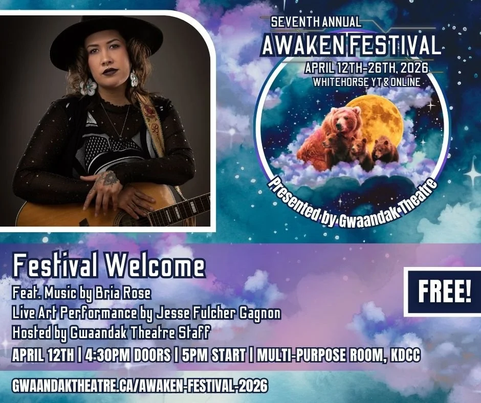 Join Gwaandak Theatre staff as we unveil the Seventh Annual Awaken Festival - there will be an opening prayer and smudge, welcome from EAD Colin Wolf, a live art performance piece by Jesse Fulcher Gagnon as well as special music by Bria Rose!