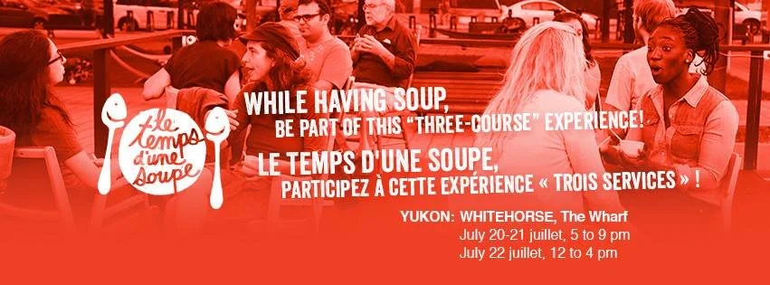 With the relational performance, While Having Soup, the artists and their accomplices invite passersby of The Wharf to take part in spontaneous conversations, in pairs, about various current issues impacting life in Whitehorse. Each conversation lasts the time it takes participants to enjoy a bowl of soup concocted by Grandma Treesaw’s Bannock and Catering. A conversation menu is supplied in order to inspire discussions; the menu will have been prepared by the people of Whitehorse during a workshop that brings to the fore issues specific to Whitehorse, so that the public has relevant topics for conversation.